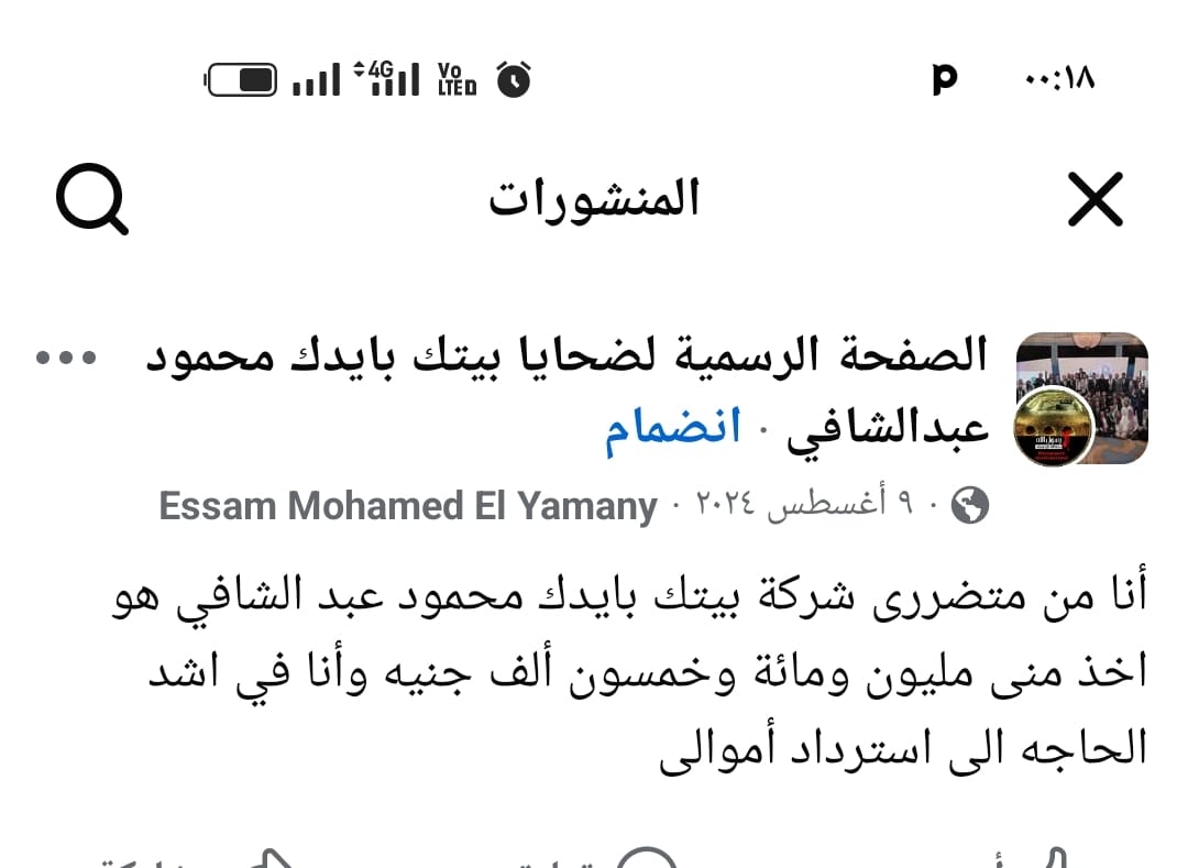 إيمانًا بأننا في دولة قانون ومؤسسات قادرة على حماية مواطنيها، توجه عدد من المتضررين من الاحتيال المالي المنسوب لـ"محمود عبد الشافي" ومشروع "بيتك بإيدك" والمطالبة بالتدخل الفوري لوقف النشاط واسترداد الحقوق، مؤكدين تعرضهم لعملية احتيال مُنظمة أدت إلى تدمير مالي ومعنوي للعديد من الأسر وتشريد عائلات.