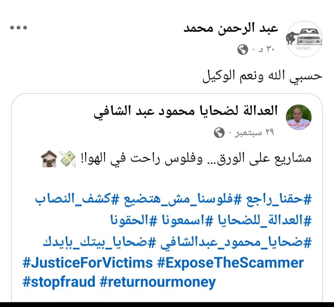 التحقيق العاجل وتطبيق القانون: فتح تحقيق شامل في الوقائع الواردة، وتطبيق القانون بصرامة على المدعو محمود عبد الشافي وكل من يثبت تورطه ومسؤول عن هذا الاحتيال.
