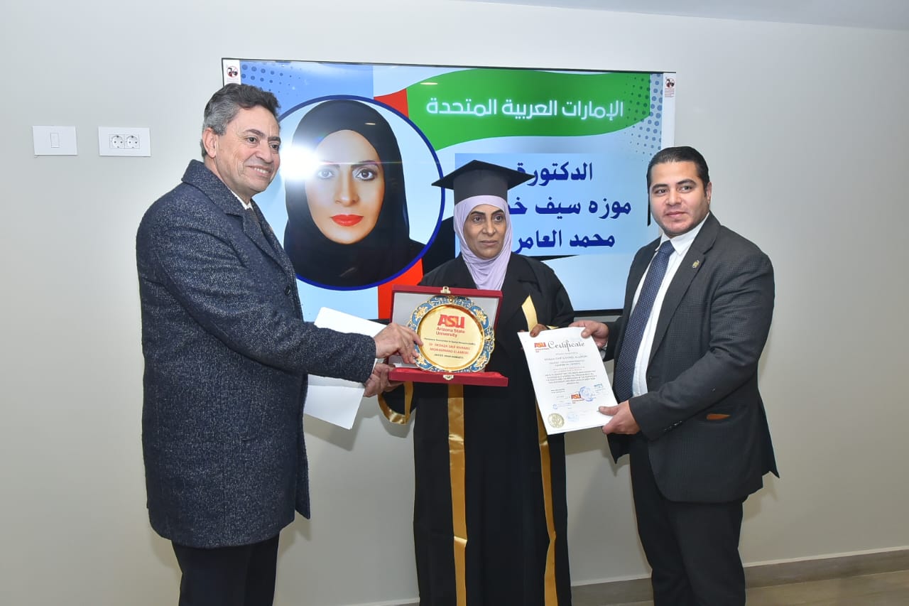 حصدت الدكتورة موزة سيف خميس العامري، من دولة الإمارات العربية المتحدة، الدكتوراه الفخرية من جامعة أريزونا بالولايات المتحدة الأمريكية، وذلك خلال فعاليات الندوة العلمية للعلوم الإنسانية لبناء الإنسان، التي عُقدت في شهر يناير 2026 بفندق النبيلة كايرو بجمهورية مصر العربية، تقديرًا لإسهاماتها النوعية في مجالات التنمية المجتمعية، وبناء القدرات، والتخطيط الاستراتيجي، وتمكين الأسرة.